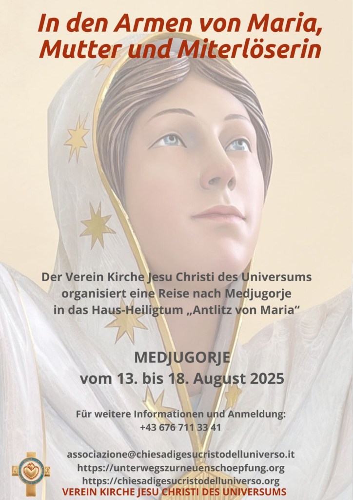 Međugorje vom 13. bis 18. August 2025 Teilen mit: Drucken (Wird in neuem Fenster geöffnet) Drucken Einen Link per E-Mail an einen Freund senden (Wird in neuem Fenster geöffnet) E-Mail Auf Facebook teilen (Wird in neuem Fenster geöffnet) Facebook Gefällt mir Wird geladen …